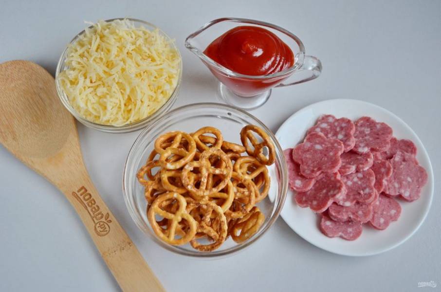 Подготовьте продукты. Колбасу тонко порежьте, она должна быть не больше самого кренделька. Сыр натрите на мелкой терке. Приступим!