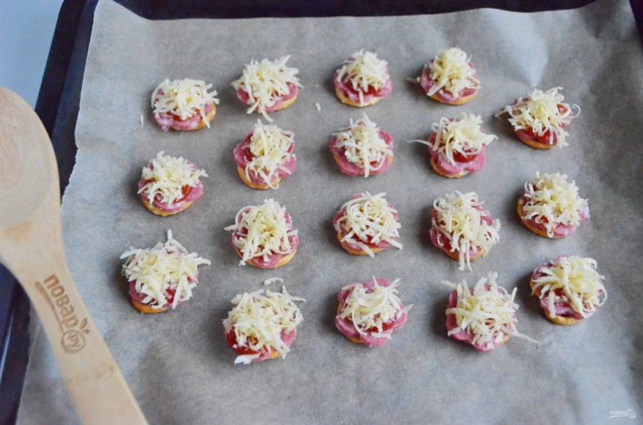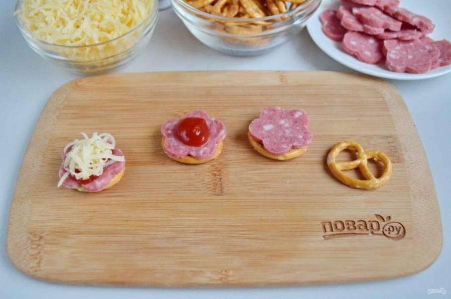 На претцель положите колечко колбаски, сверху капельку кетчупа и щепотку тертого сыра.