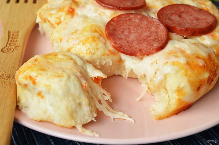 Пицца на шариках из теста готова! Подавайте ее горячей, именно тогда сыр так красиво тянется!