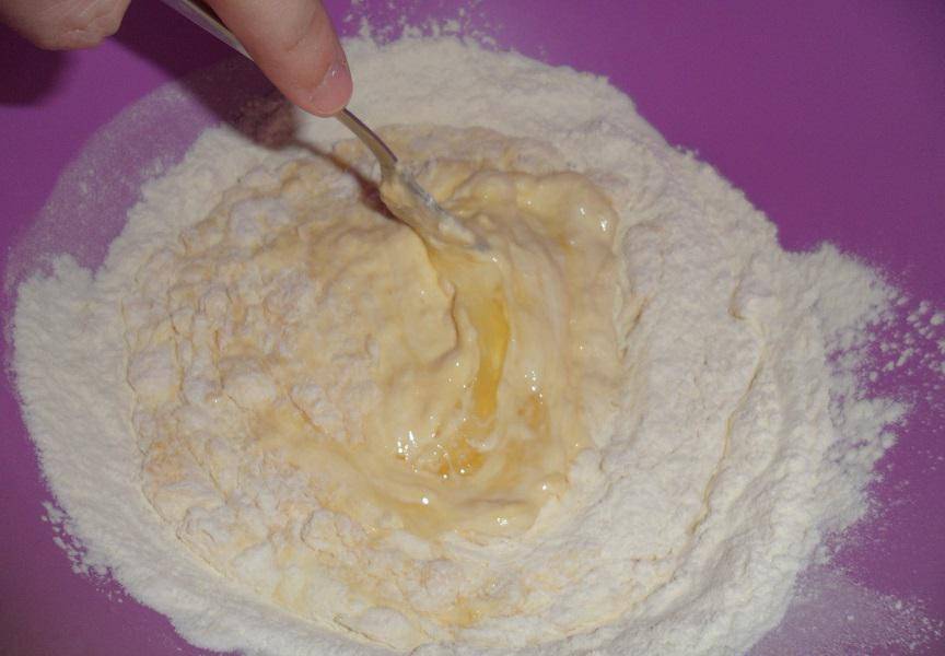 Замесите тесто: смешайте кефир, яйца, майонез, муку.