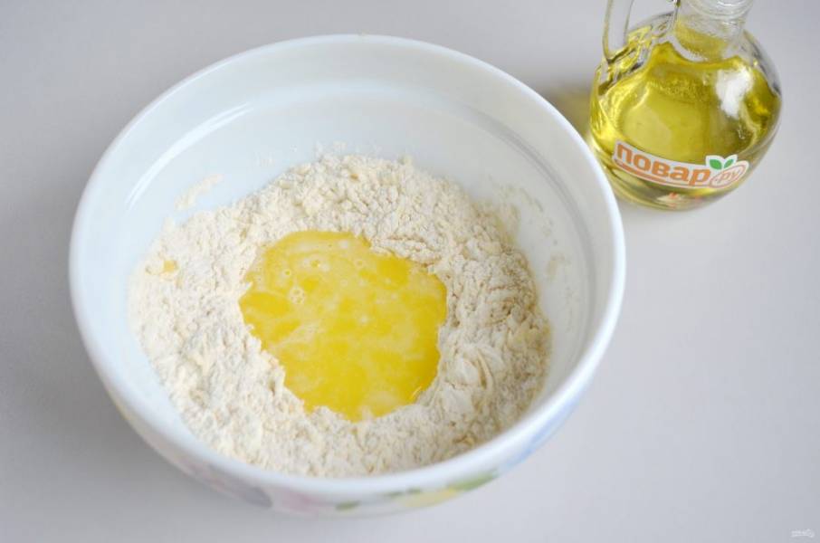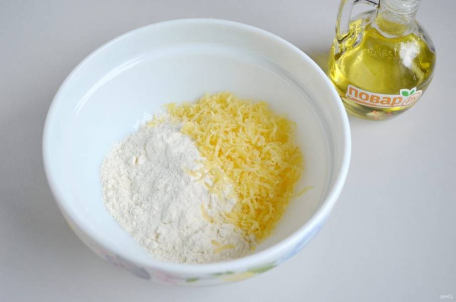 2. Сделайте тесто: соедините муку с разрыхлителем, солью, положите тертый сыр, перемешайте.