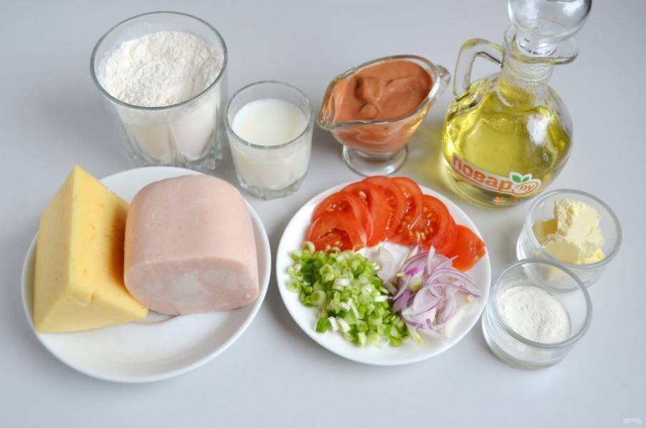 1. Подготовьте продукты для теста и начинки. Я решила сделать с ветчиной, помидором и зеленым луком.