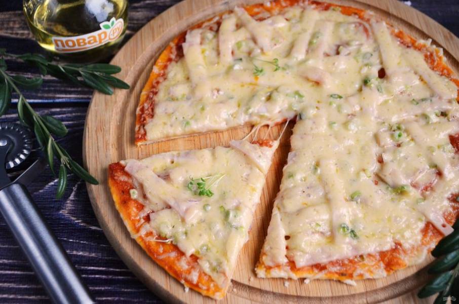 Начинку для пиццы можно подобрать на свой вкус, начиная от морепродуктов, грибов, мяса и заканчивая ветчиной или колбасой. Тоненькое тесто, нежное и вкусное, оно отлично подойдет к любым продуктам.