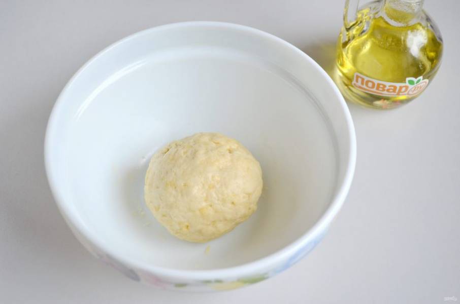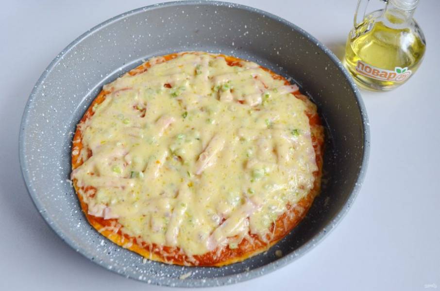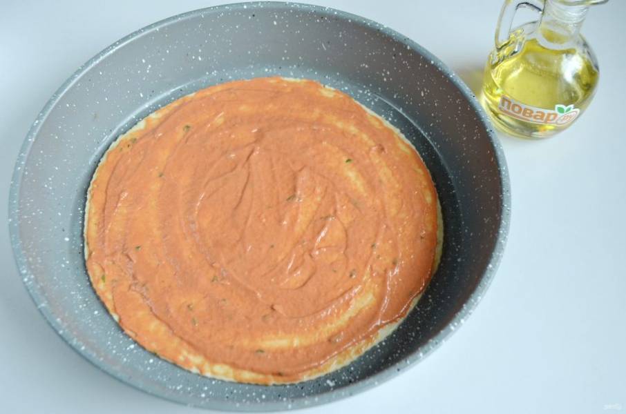 5. Раскатайте тесто в круг, выложите в форму для запекания, смажьте хорошо соусом (кетчуп+майонез).