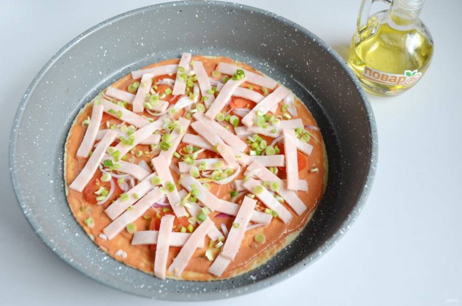 6. Положите начинку. Я порезала тонко помидор, зеленый лук, ветчину.