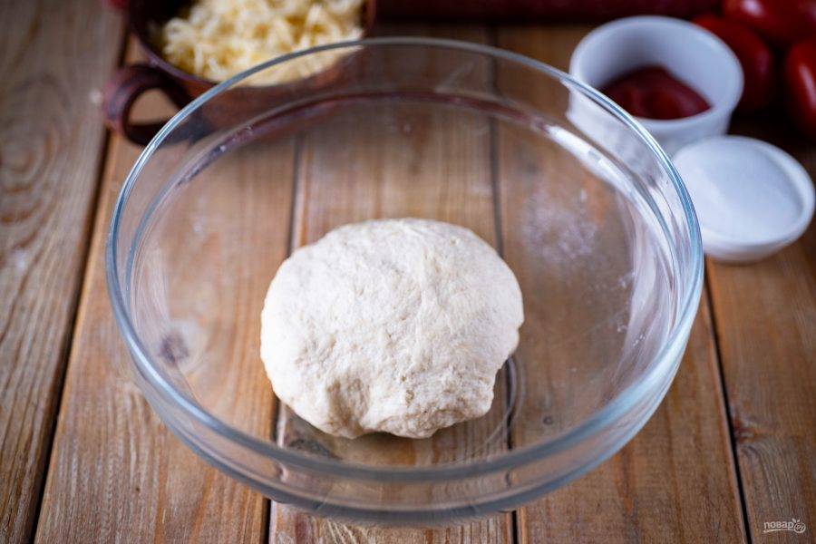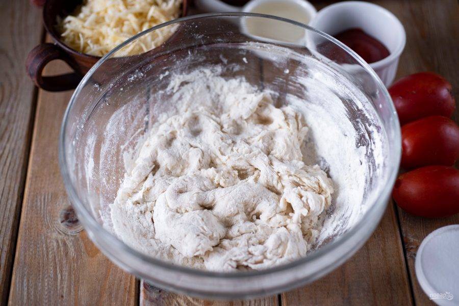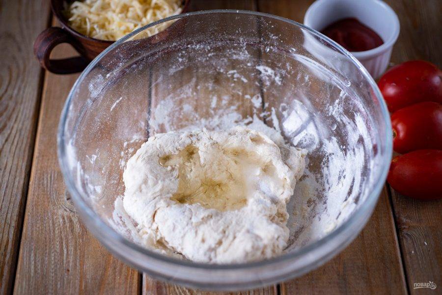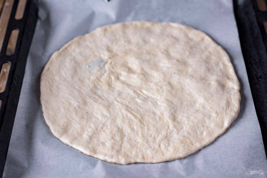 Противень выложите пергаментом для выпечки, поверх растяните тесто руками в круглую тонкую лепешку — основу для пиццы.