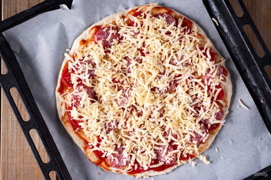 Присыпьте все тертым на крупную терку сыром. Противень с пиццей отправьте выпекаться в уже разогретую до 180 градусов духовку на 10-15 минут.