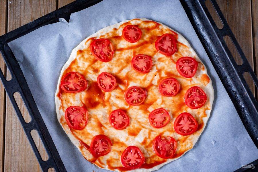 Смажьте основу тонким слоем томатного соуса, поверх разложите кружочки томатов.