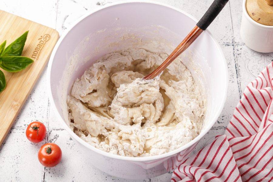 Перемешайте всё ещё раз ложкой, а затем продолжите замес руками. Тесто должно быть мягкое и чуть липкое. Смажьте руки растительным маслом, соберите тесто в шар, накройте миску полотенцем и оставьте в тёплом месте для подъёма, примерно на час-полтора.