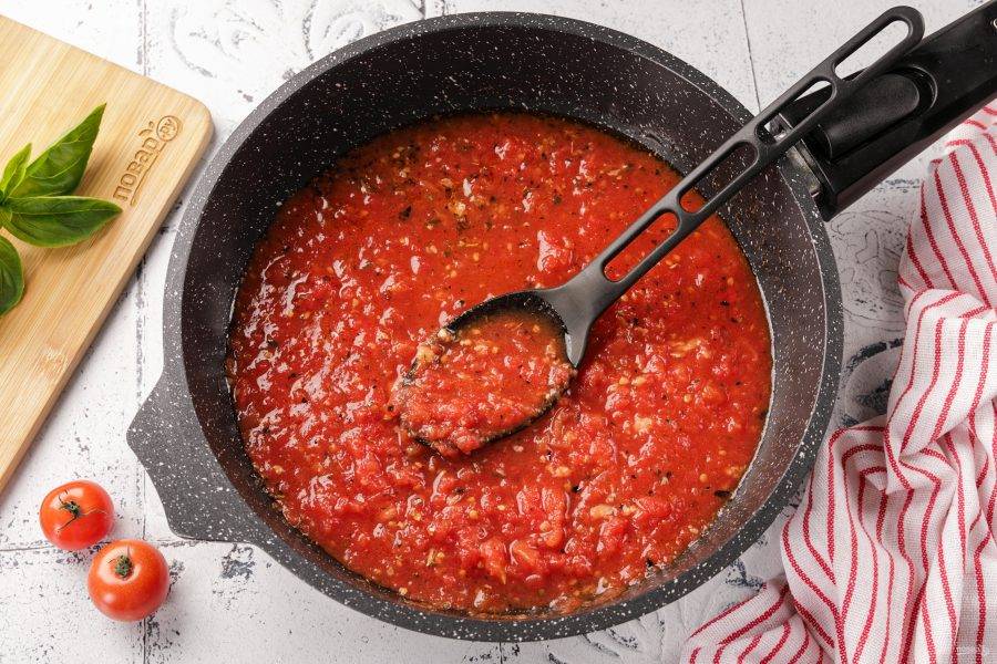 Добавьте измельченные томаты и 1/2 ч.л. сахара. Как только соус закипит, уменьшите огонь до минимума и варите около 20-30 минут. При необходимости добавьте соль по вкусу, я не добавляла.