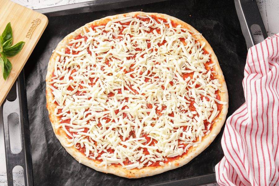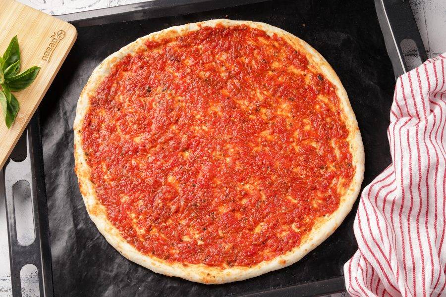 Равномерно распределите соус для пиццы по поверхности основы для пиццы, оставляя бортики пустыми.