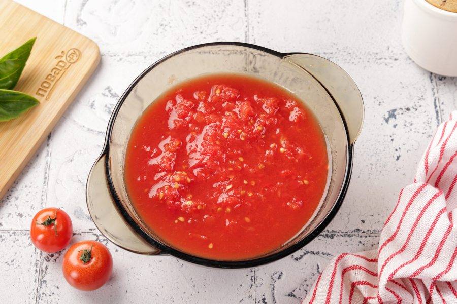 Чтобы приготовить соус для пиццы Нью-Йорк, измельчите консервированные томаты вместе с соком. Лучше размять помидоры руками, чтобы остались небольшие кусочки. В крайнем случае можно быстро измельчить в блендере, но не до однородного пюре. Шкурку я снимаю.