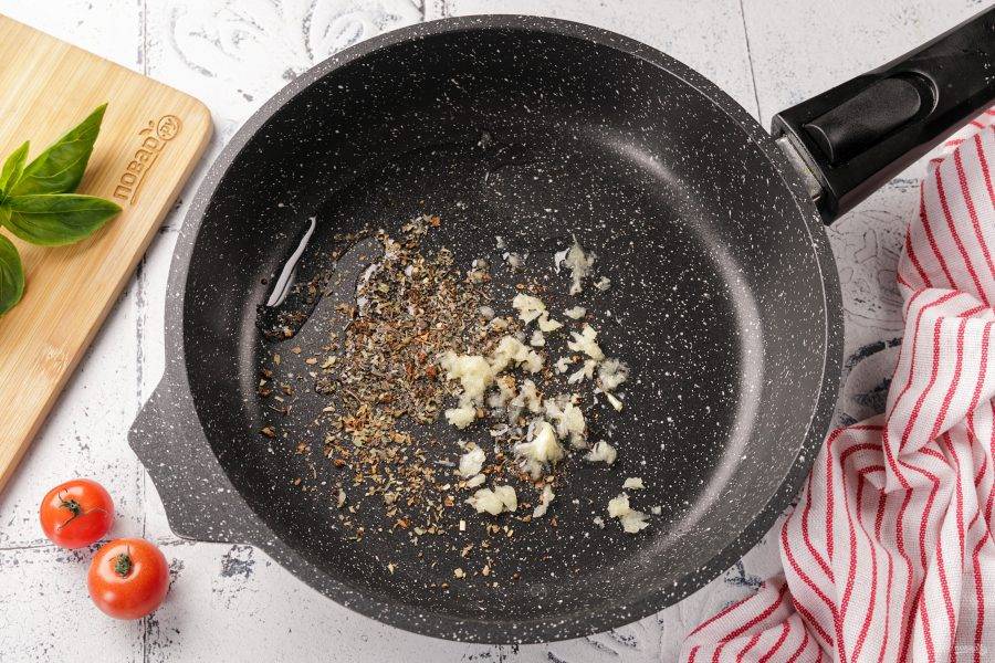 В сотейник или в сковороду налейте 1 ст.л. растительного масла. Добавьте измельченный чеснок, орегано и базилик, можно добавить молотый перец чили и щепотку соли. Жарьте на среднем огне, постоянно помешивая, 1-2 минуты.