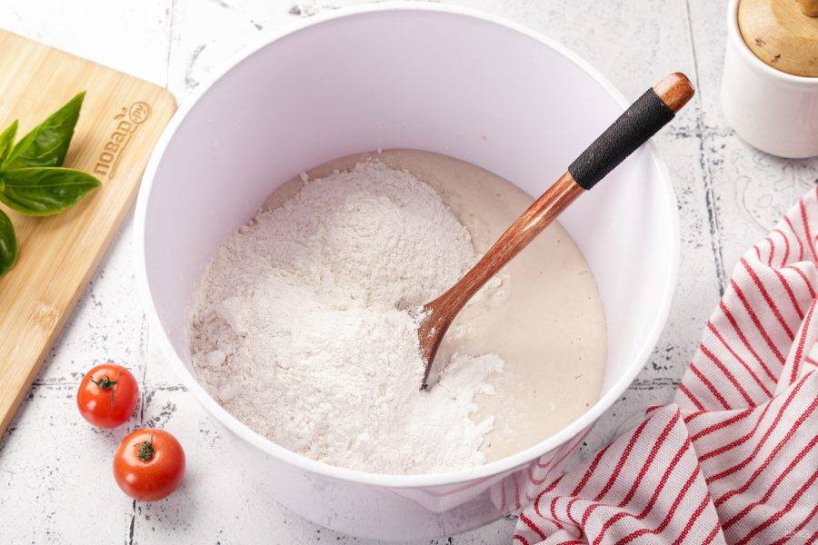 Затем добавьте 1 ч.л. соли и муку, перемешайте.