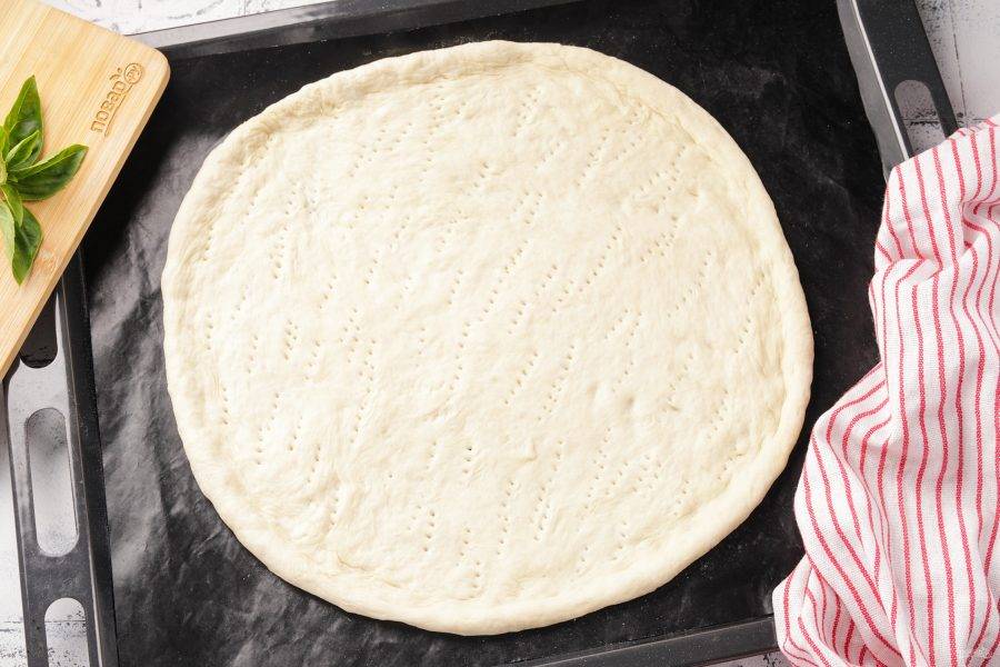 Из теста для пиццы на присыпанной мукой рабочей поверхности раскатайте круг диаметром около 30 см. и толщиной около 5-6 мм. Переложите на противень и руками сформируйте бортики, дно наколите вилкой.