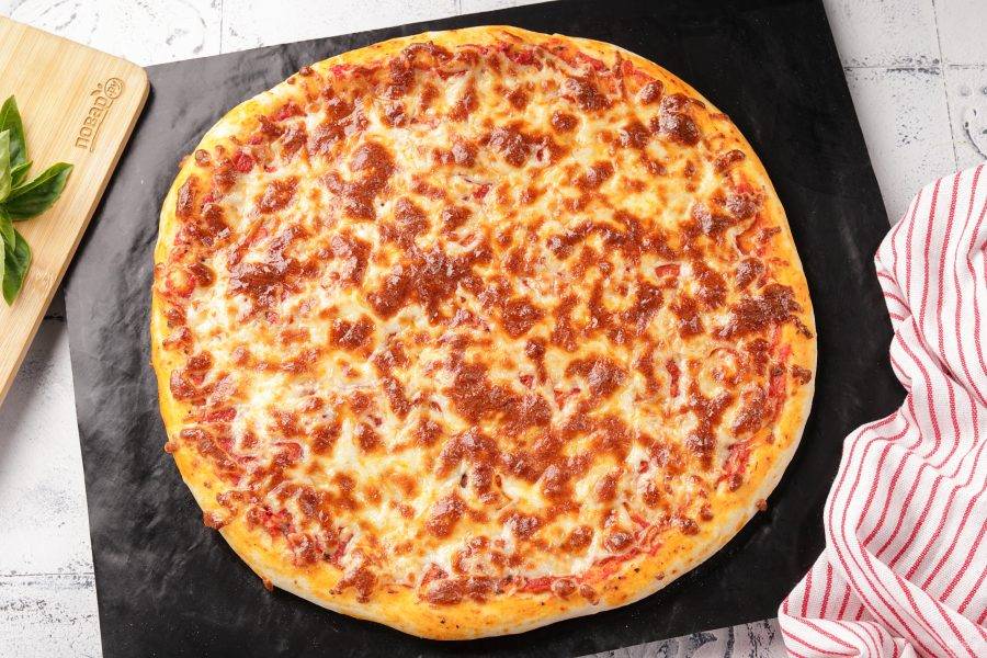 Выпекайте пиццу Нью-Йорк в тщательно разогретой до 250 градусов духовке от 7 до 10 минут, пока сыр не расплавится, а корочка не станет воздушной и золотистой.