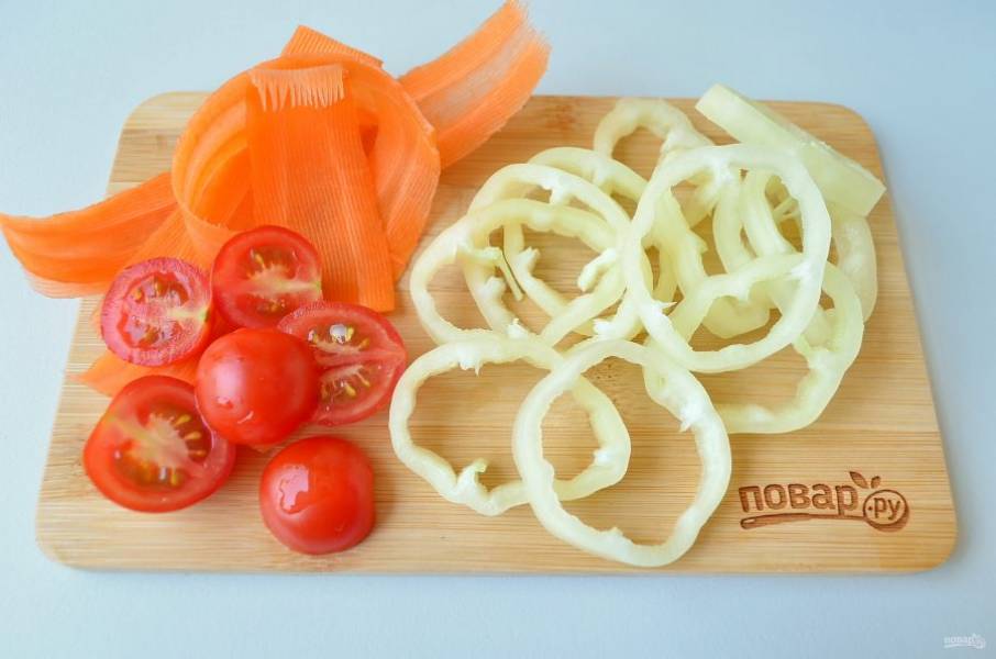 5. Вымойте остальные овощи, порежьте помидоры на половинки, перец болгарский – колечками или полуколечками, морковь – ленточками (я использовала овощерезку).