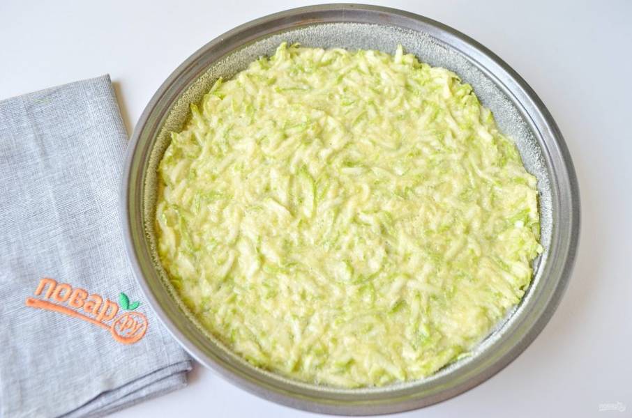 4. Выкладывайте ложкой кабачковое тесто, распределяйте равномерно, диаметр моей формы – 22 см.