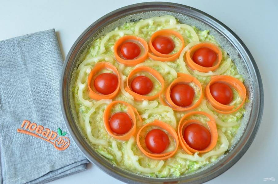 6. Укладывайте на тесто овощи, как вам нравится, я положила помидорчики, вокруг – ленточки моркови, между ними – болгарский перчик.