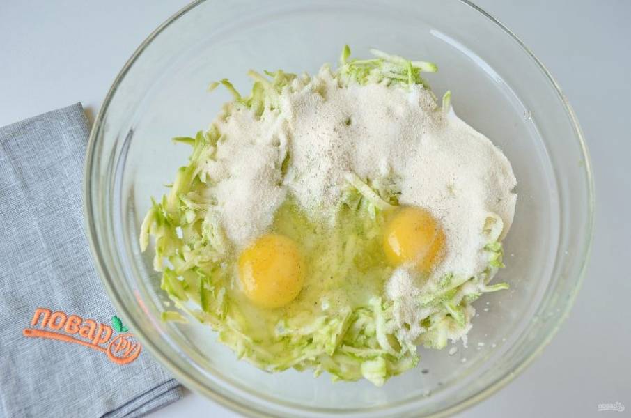 2. Вымойте кабачки, обрежьте хвостики с двух сторон, натрите их на крупной терке. Добавьте яйца, манку, соль, перец, перемешайте.