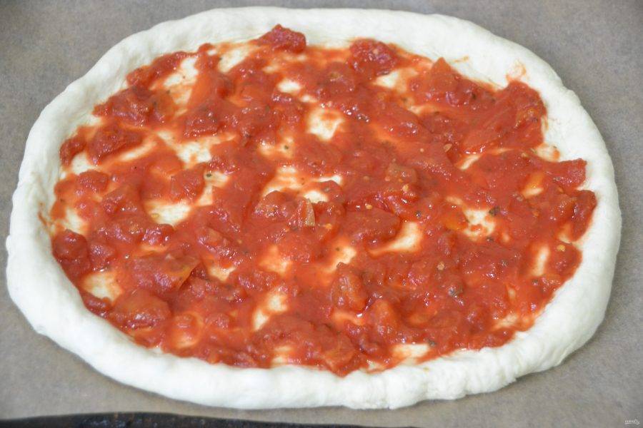 Выложите томатную пикантную смесь на тесто, разровняйте.