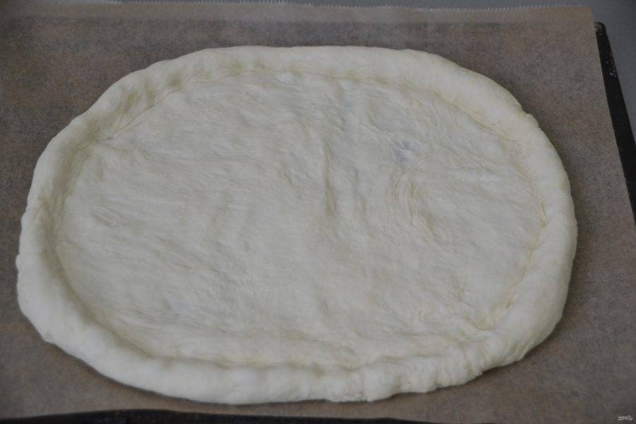 Раскатайте тесто в пласт, переложите его на лист для выпечки, сформируйте бортики.