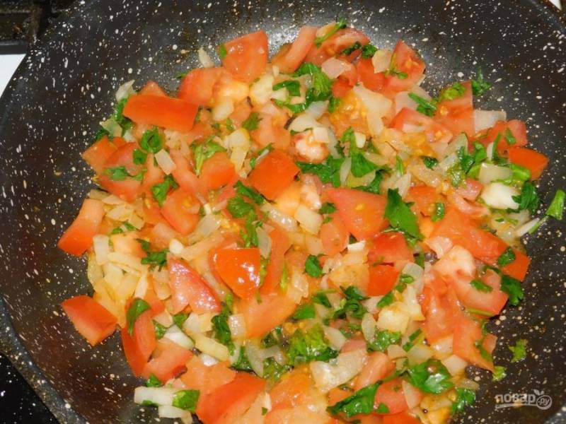 Отдельно обжарьте лук. Добавьте к нему помидоры, чеснок и зелень. Обжарьте все вместе минуты 2-3.