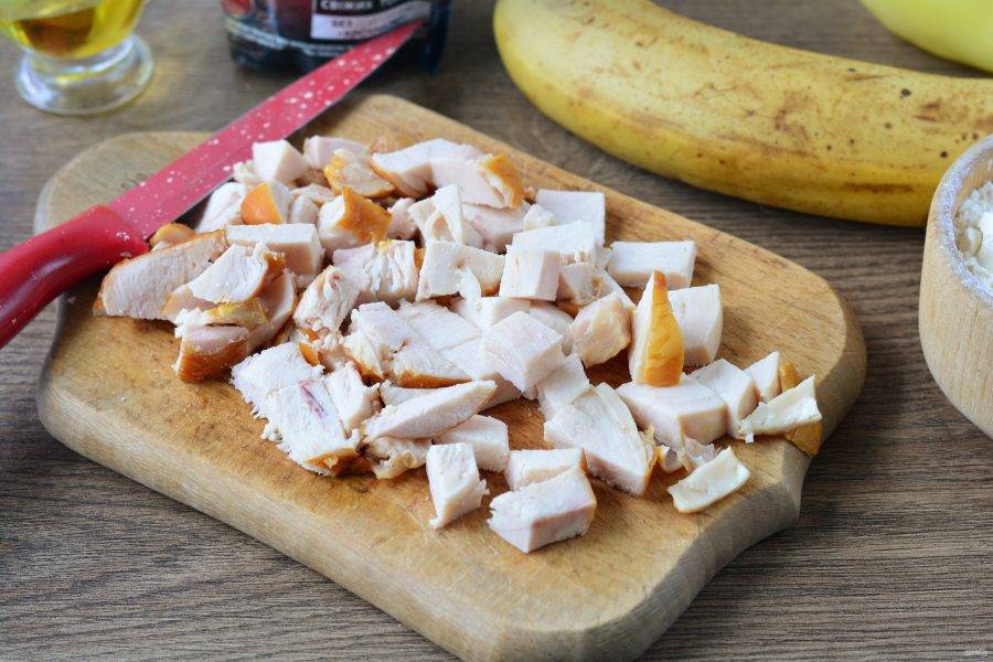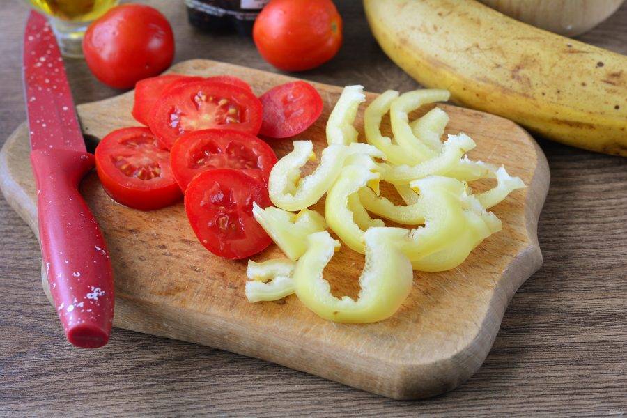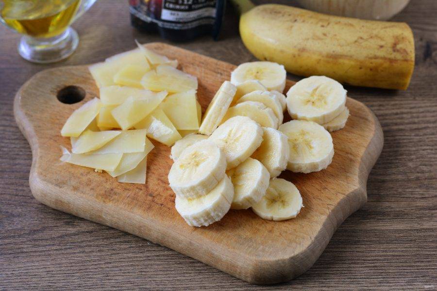 Нарежьте бананы колечками средней толщины. Сыр натрите тонкими пластинками.