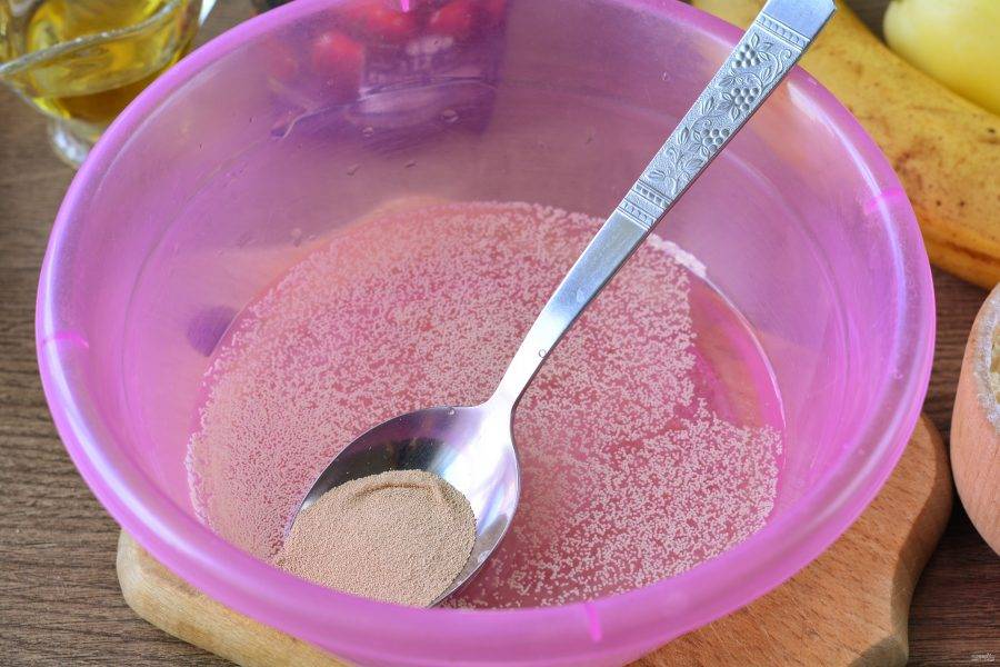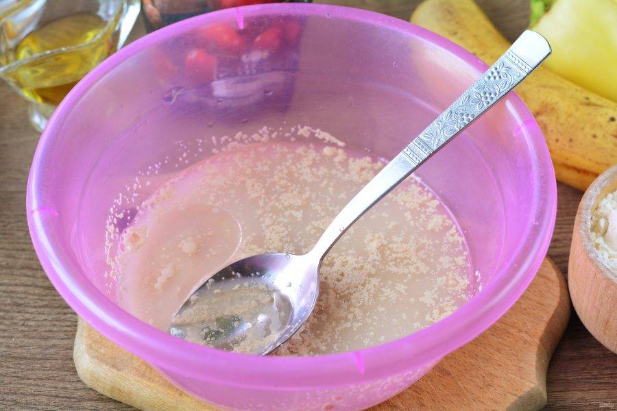В теплую воду всыпьте сухие дрожжи и сахар.