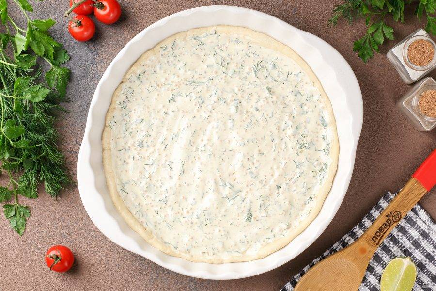 Я буду готовить две пиццы диаметром 27 см. Тесто разделите и тонко раскатайте на присыпанной мукой поверхности. Перенесите в смазанную маслом форму, руками сформируйте бортики и наколите тесто вилкой, чтобы оно в процессе не вздулось. Смажьте горчичным соусом.