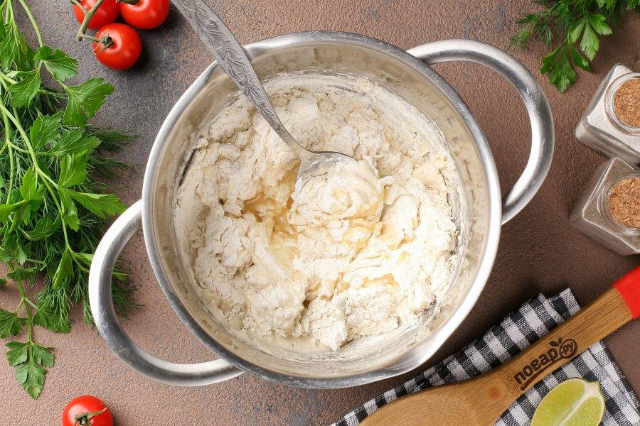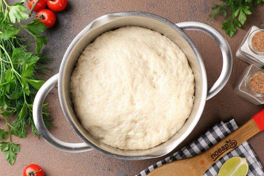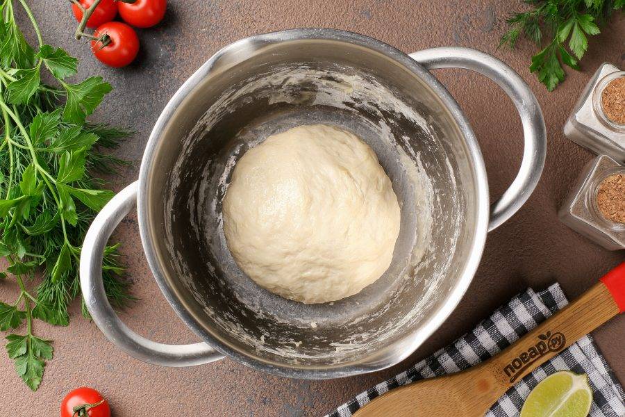 Замесите руками мягкое и чуть липкое тесто. Смажьте его растительным маслом, накройте полотенцем и оставьте в тёплом месте на 1-1, 5 часа.