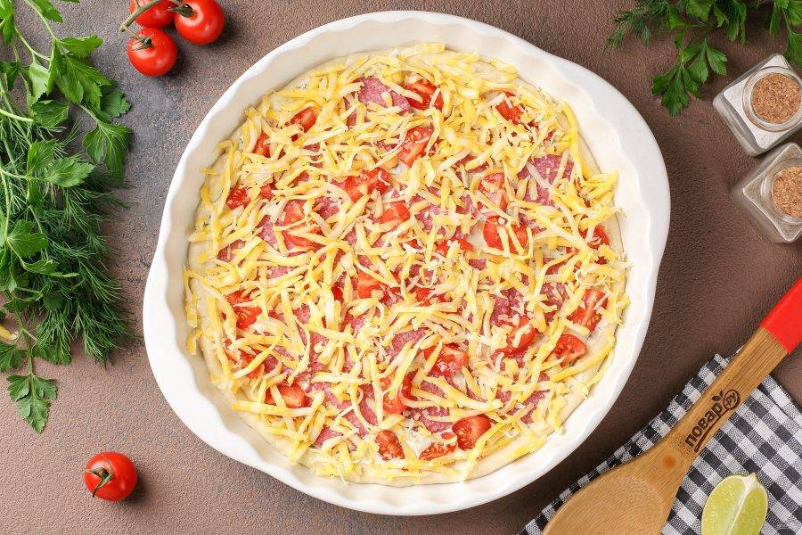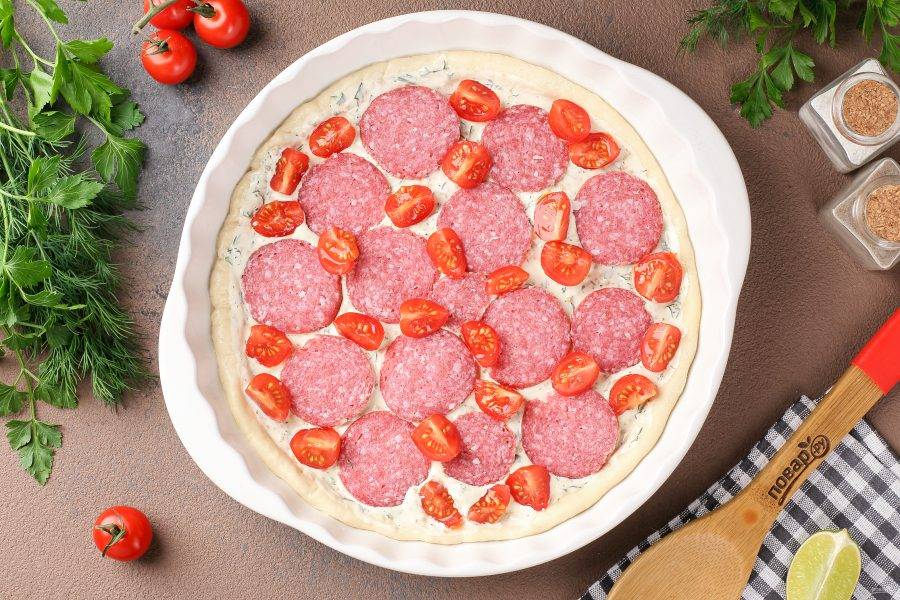 Сверху выложите любую начинку по вкусу, у меня колбаса и помидоры черри.