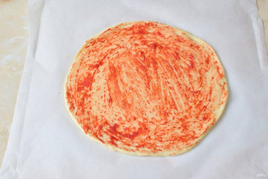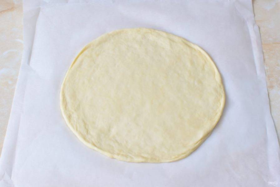 Раскатайте тесто в круг и выложите на кулинарный пергамент.