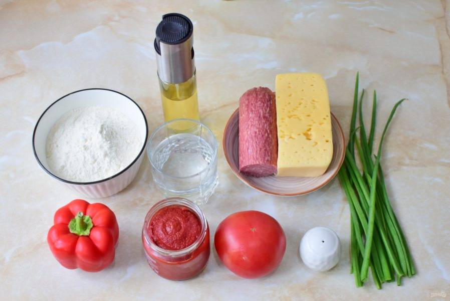 Для приготовления пиццы подготовьте необходимые ингредиенты. Муку просейте через сито, чтобы насытить её кислородом.