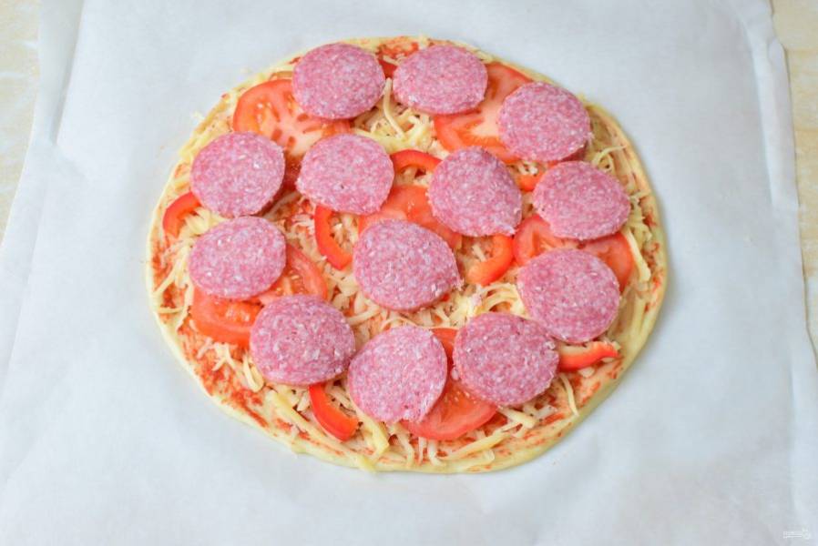 Выложите нарезанный болгарский перец и копченую колбасу.