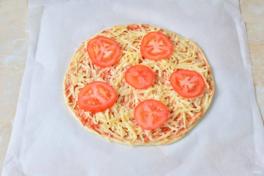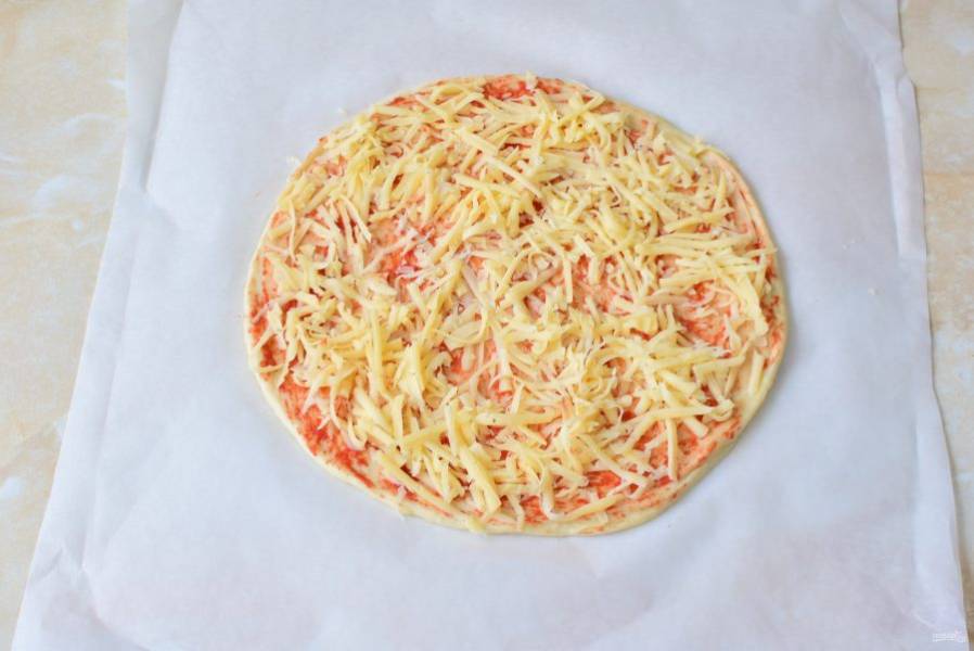 Сверху добавьте совсем немного сыра. Поставьте пиццу в духовку, предварительно разогретую до 190 градусов, примерно на 15 минут. Ориентируйтесь по своей духовке.