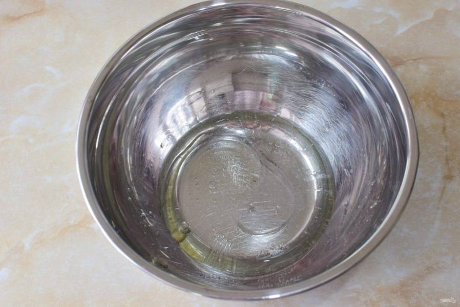 Для теста налейте в чашу теплую воду и добавьте оливковое масло.