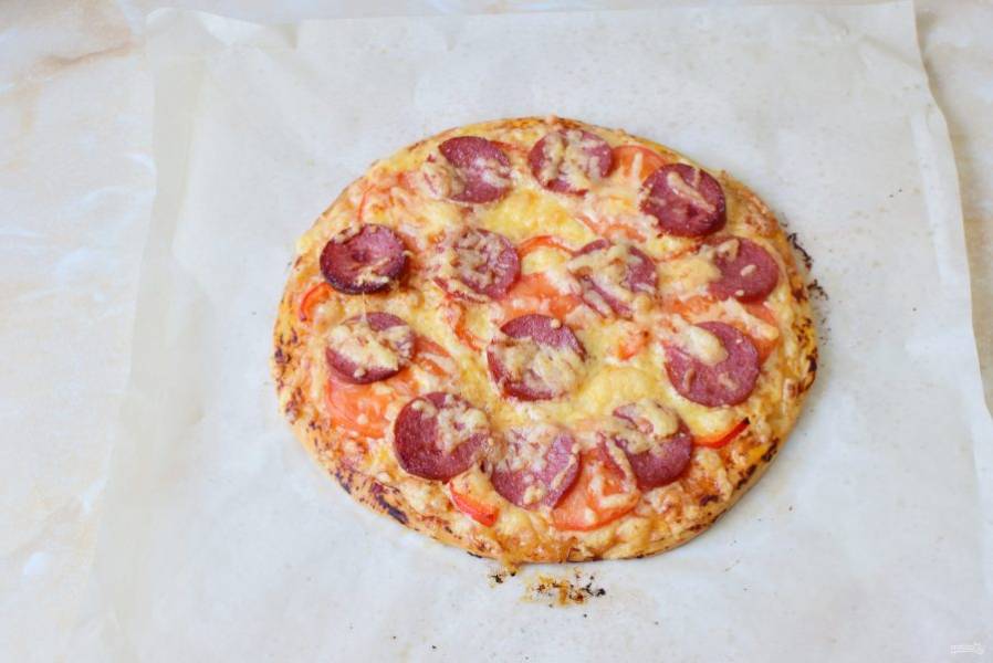 Быстрая, простая и вкусная пицца на бездрожжевом тесте. Вкусовое сочетание копченой колбасы с сочностью помидоров никого не оставит равнодушным. Обязательно приготовьте!