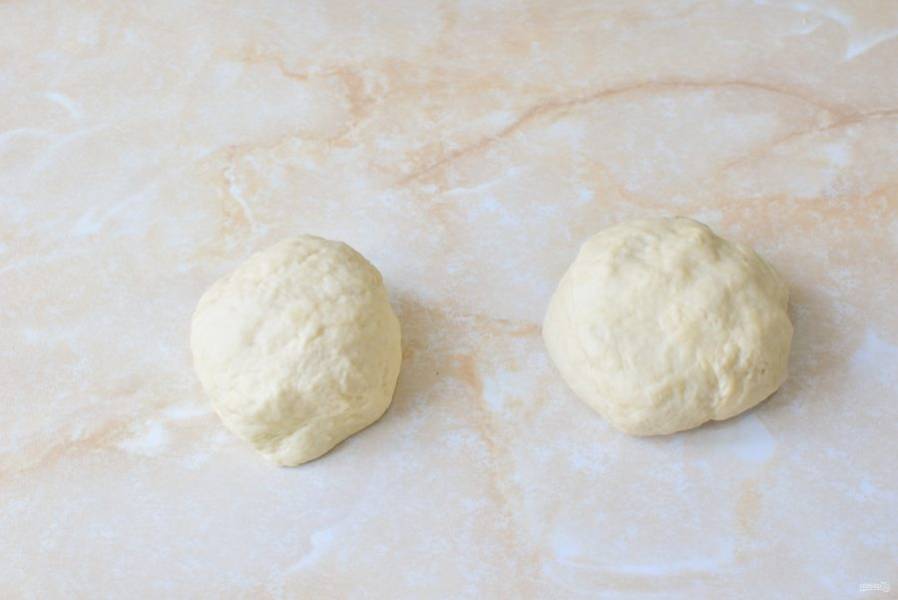 Разделите тесто на 2 части, чтобы получилось 2 пиццы.