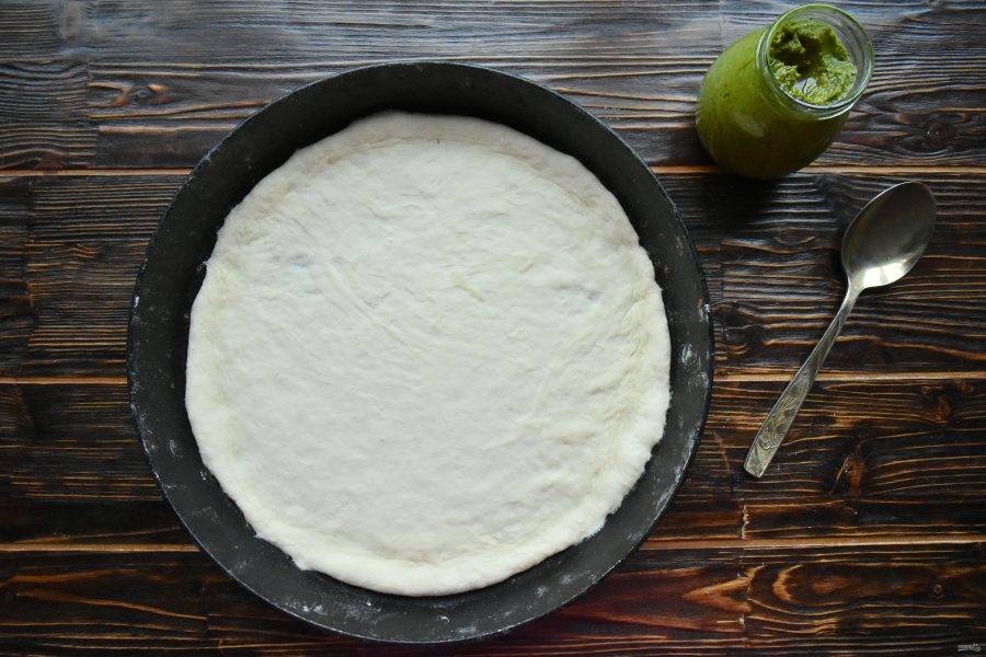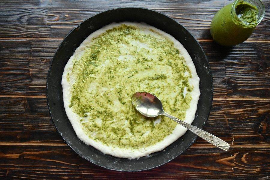 Тонким слоем нанесите на тесто соус песто.