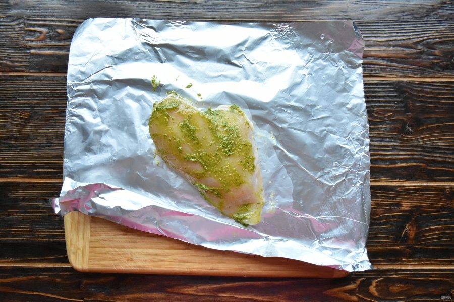 Филе куриной грудки замаринуйте в соусе песто. Добавьте соль и молотый перец по вкусу. Заверните филе в фольгу и запеките до готовности в духовке, разогретой до 200 градусов в течение 20-25 минут.