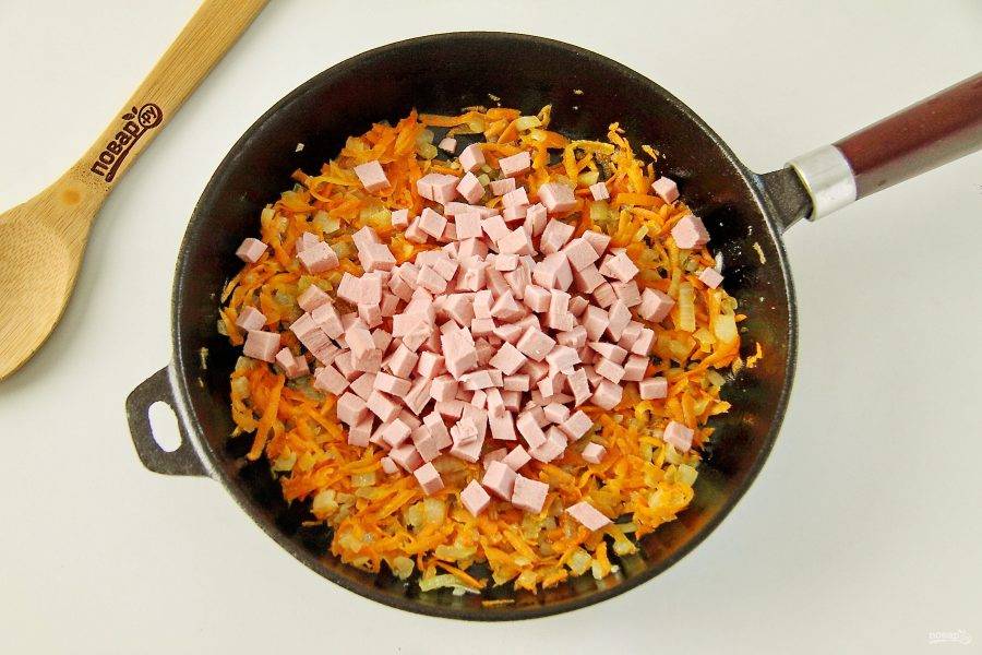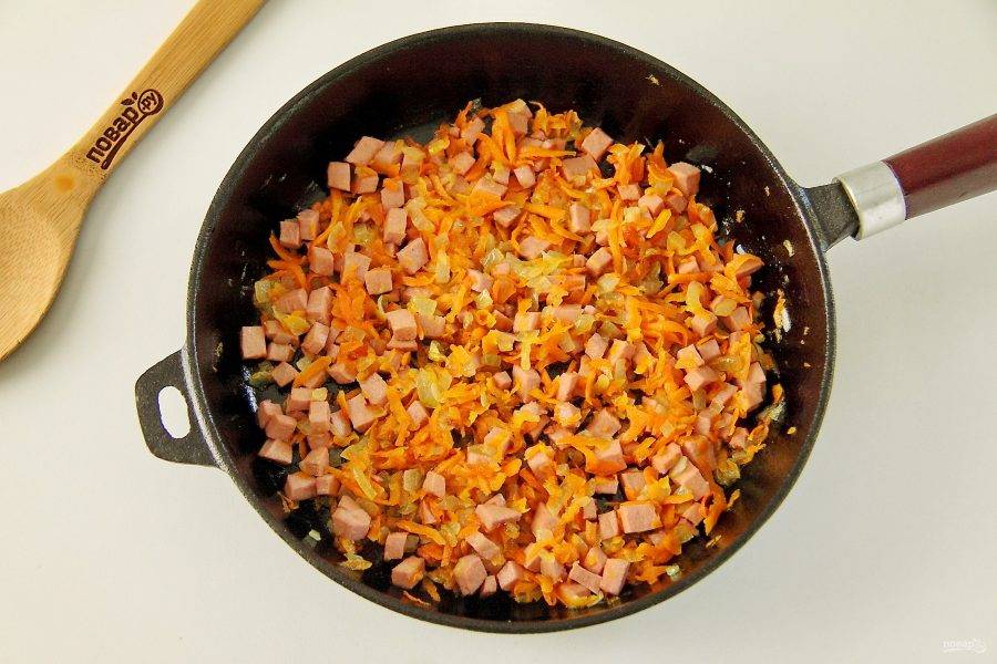 Обжарьте овощи на сковороде до мягкости. Добавьте нарезанную кубиками колбасу.