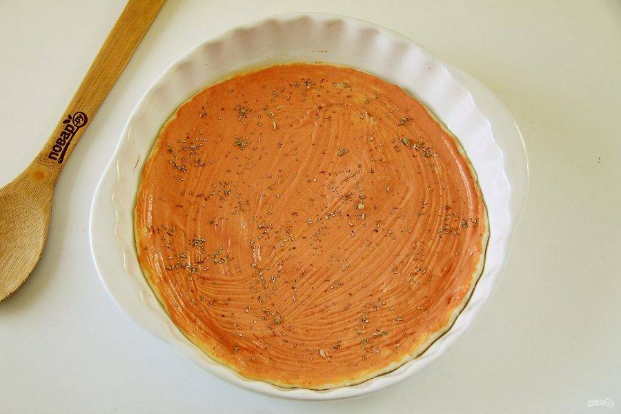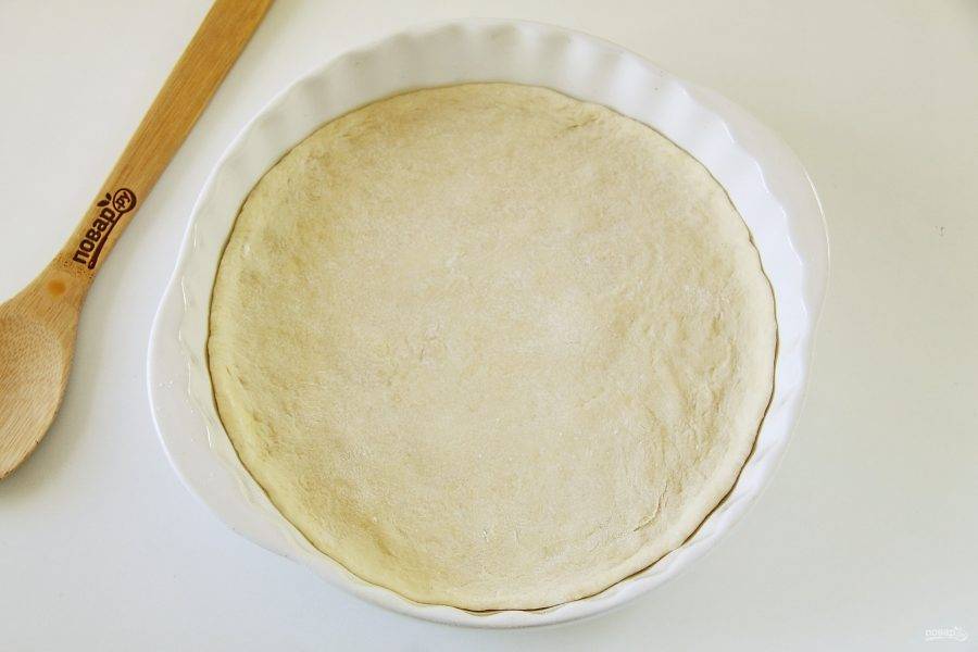 Тесто разделите на две части. Вторую часть можно убрать в морозильную камеру и достать тесто для приготовления в нужный момент, а можете приготовить сразу одновременно две пиццы. Начинка может быть одинаковая или разная - на ваш выбор. Тесто раскатайте в форме круга и аккуратно переложите в смазанную маслом форму для выпечки. Руками сформируйте небольшие бортики.