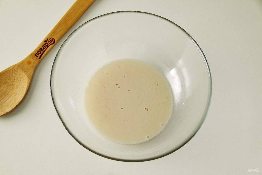В теплой воде растворите сахар и дрожжи. Оставьте на некоторое время до появления характерной "шапочки".