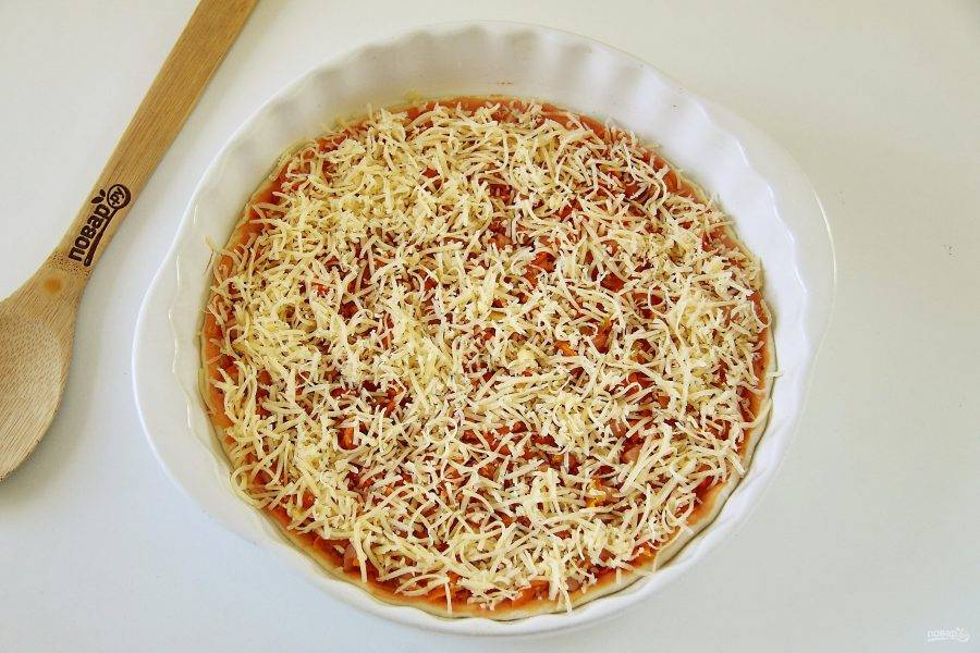 Посыпьте все тертым сыром и запекайте пиццу при максимальной температуре около 7-10 минут.
