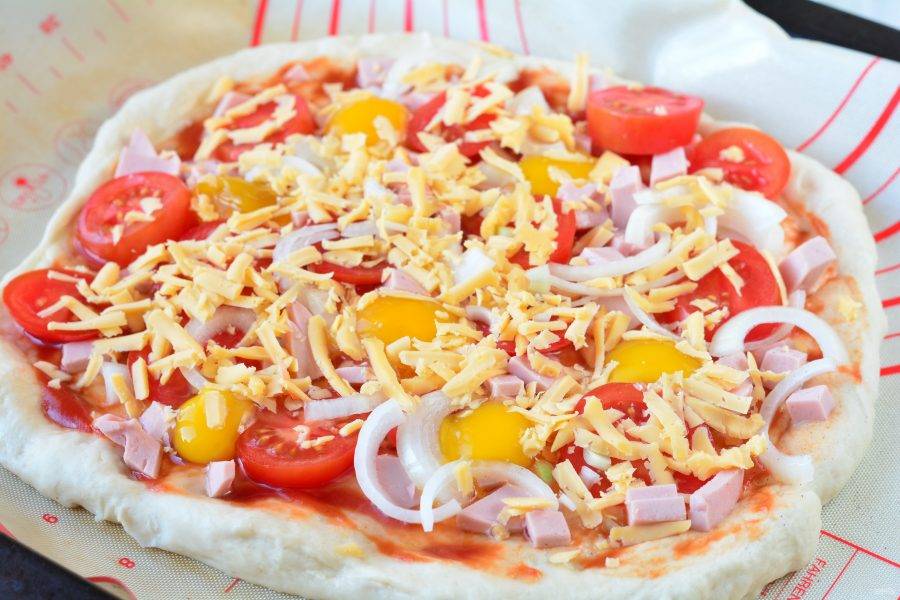 Выложите на пиццу нарезанный тонкими полукольцами лук, разбейте перепелиные яйца и выложите их также на пиццу, присыпьте тертым сыром.