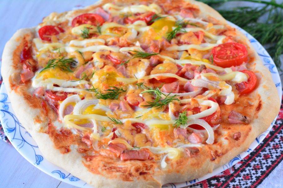 Готовую пиццу можно дополнить небольшим количеством свежей зелени, например, укропом. Приятного аппетита!