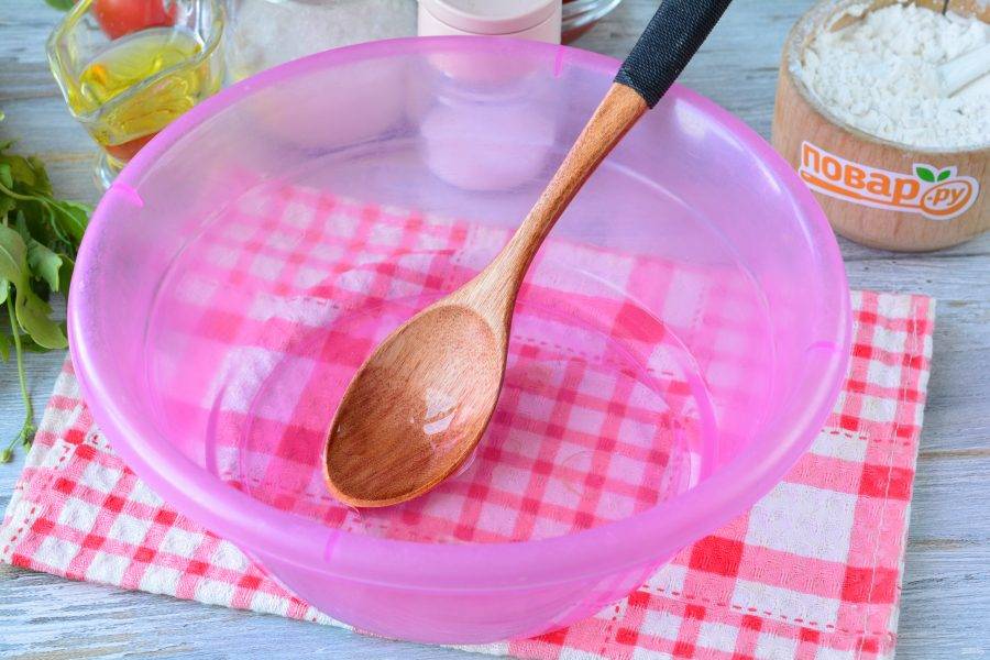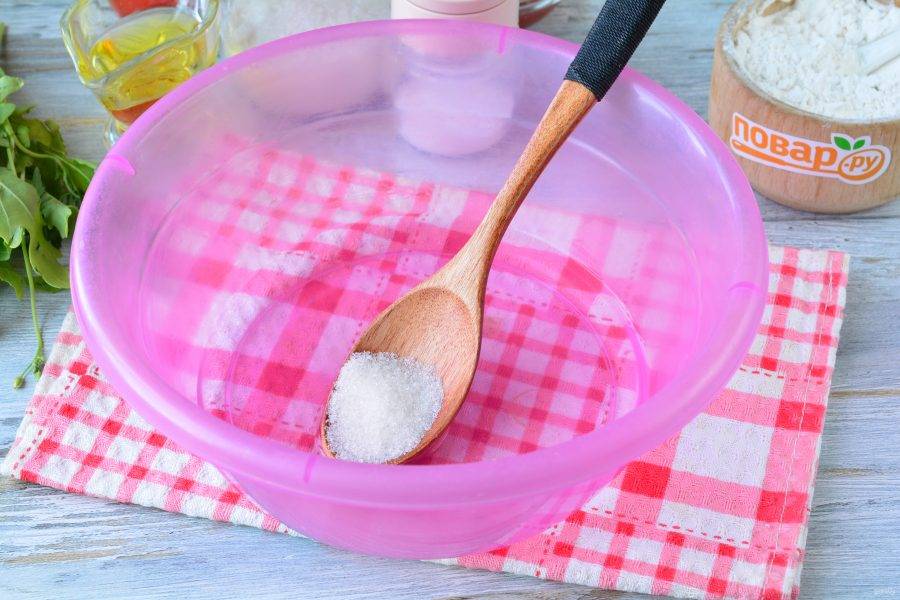 Влейте теплую воду в миску, всыпьте соль и сахар, размешайте.