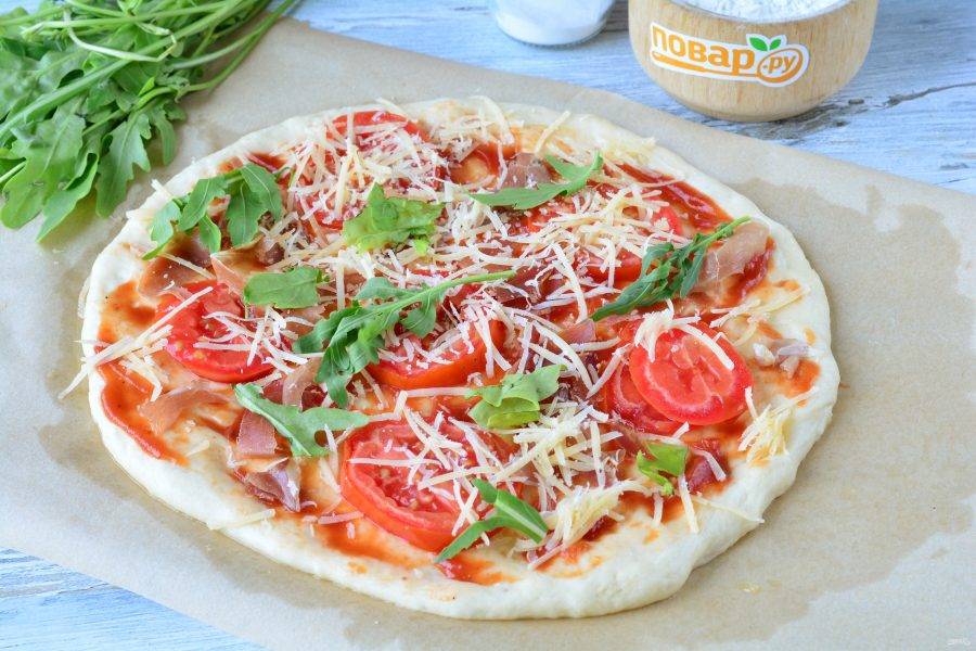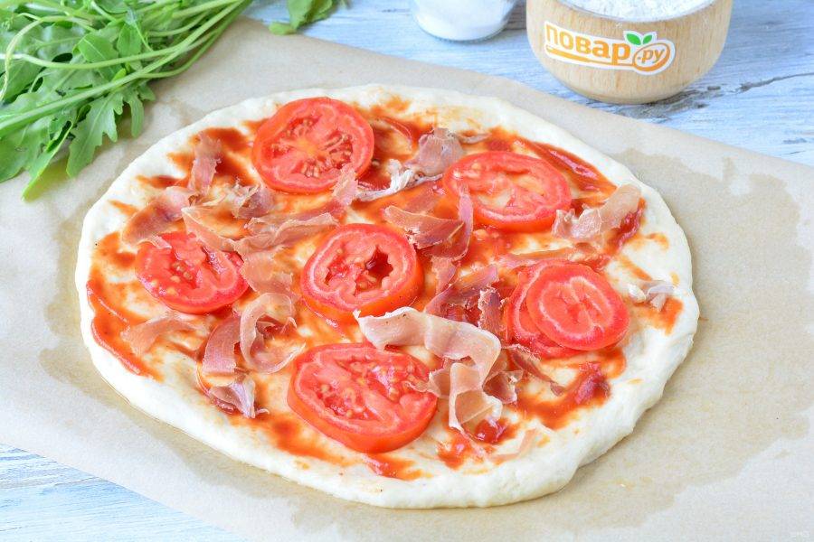 Раскатайте тесто в тонкий пласт круглой формы. Смажьте томатным соусом, выложите кусочки помидоров и прошутто.