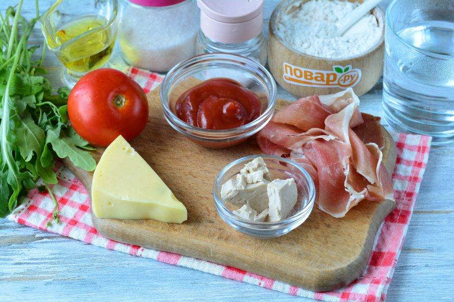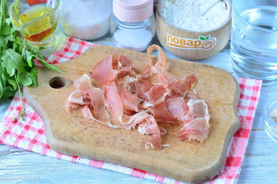 Приготовьте итальянскую пиццу с прошутто и рукколой. Тесто замесите дрожжевое, а для начинки возьмите ароматную ветчину-прошутто, томатный соус, сыр и рукколу.